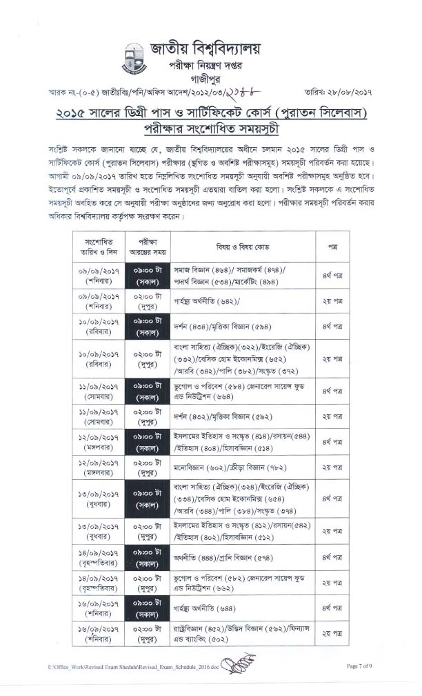 ডিগ্রী পাস (পুরাতন সিলেবাস) পরীক্ষা ২০১৫ এর সংশোধিত সময়সূচি 28-08-2017