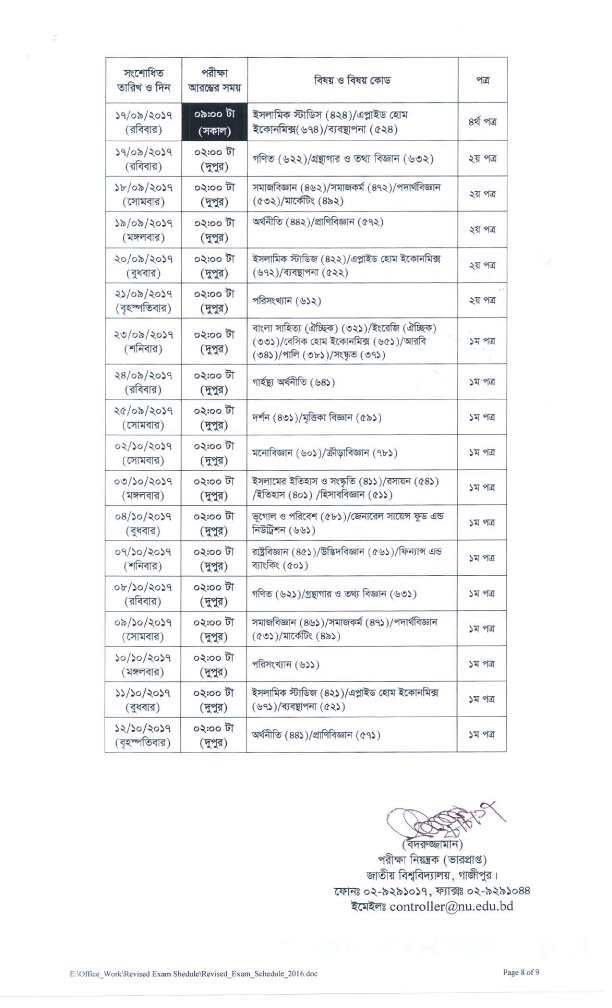 ২০১৬ সালের অনার্স ৪র্থ বর্ষ পরীক্ষার সংশোধিত সময়সূচি (২৮-০৮-২০১৭)