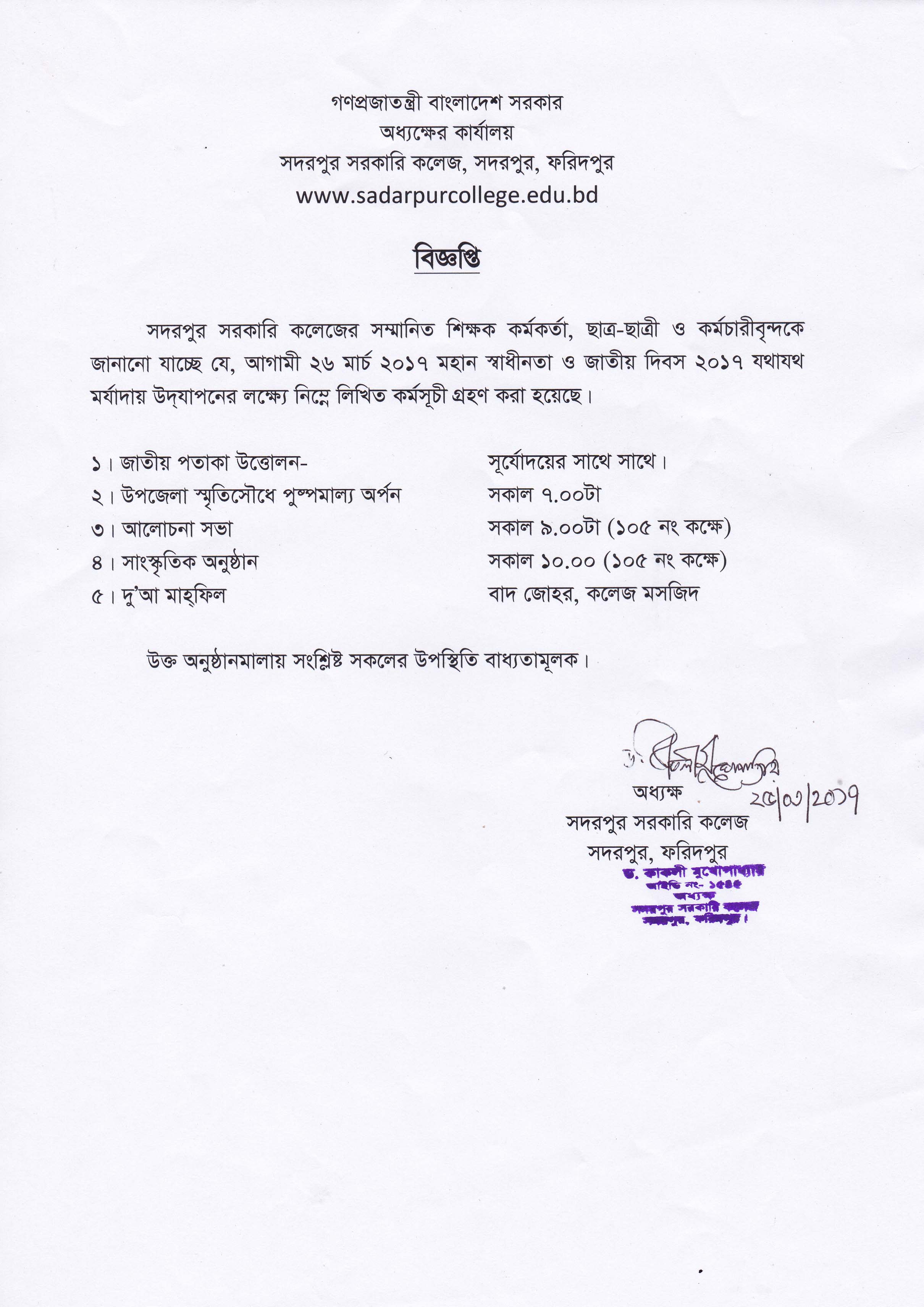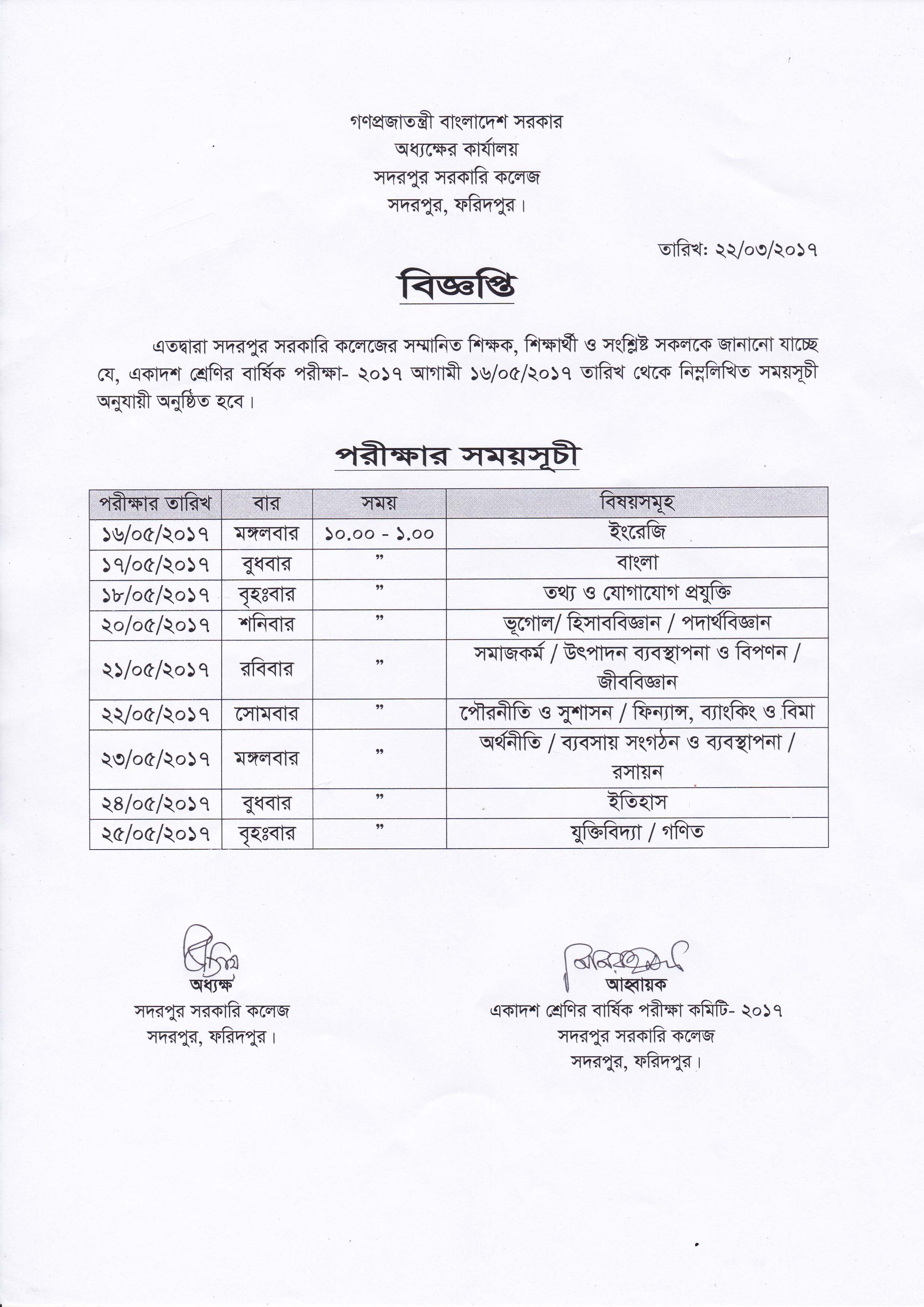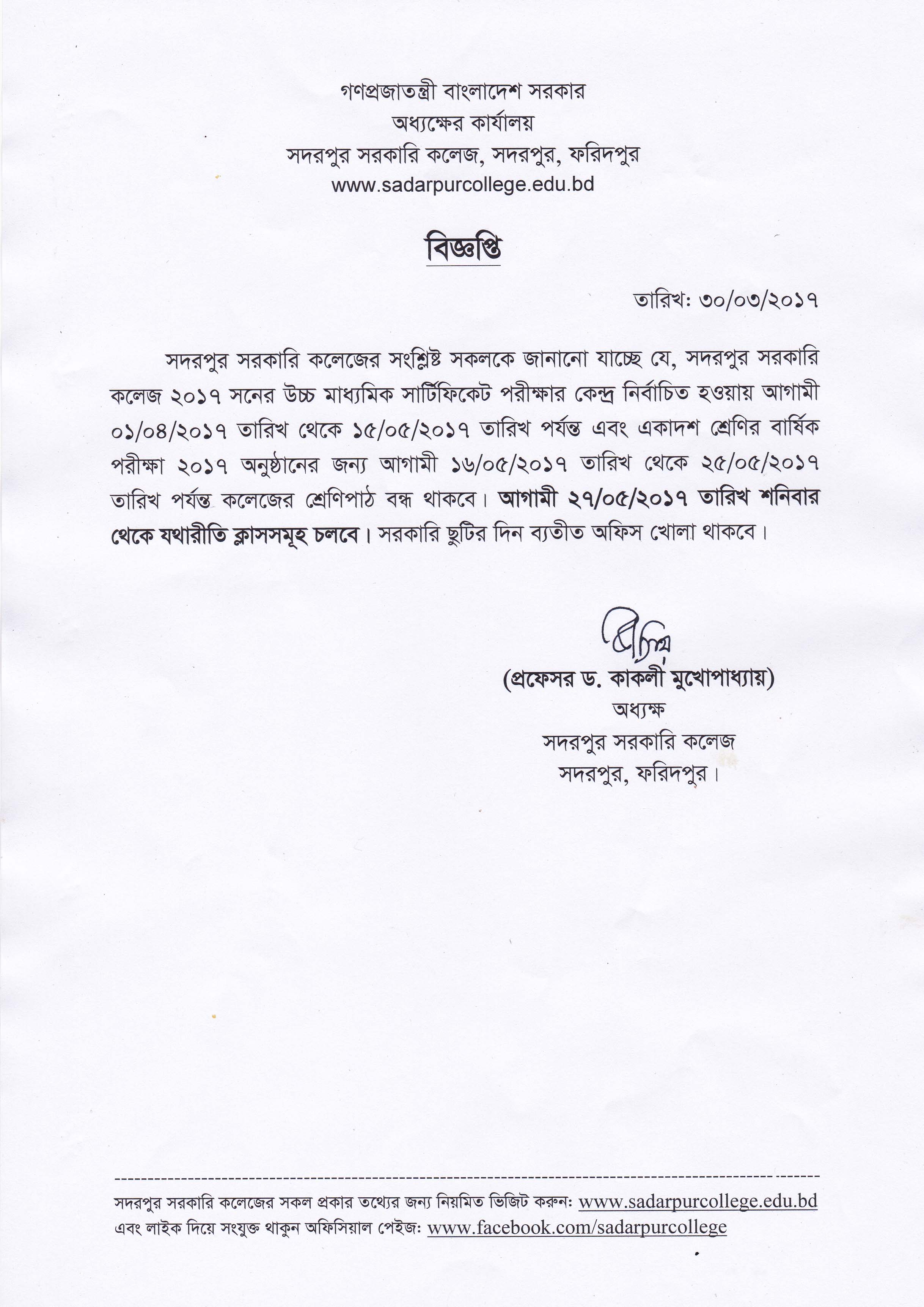 সদরপুর সরকারি কলেজের সংশ্লিষ্ট সকলকে জানানো যাচ্ছে যে, সদরপুর সরকারি কলেজ ২০১৭ সনের উচ্চ মাধ্যমিক সার্টিফিকেট পরীক্ষার কেন্দ্র নির্বাচিত হওয়ায় আগামী ০১/০৪/২০১৭ তারিখ থেকে ১৫/০৫/২০১৭ তারিখ পর্যন্ত [...]