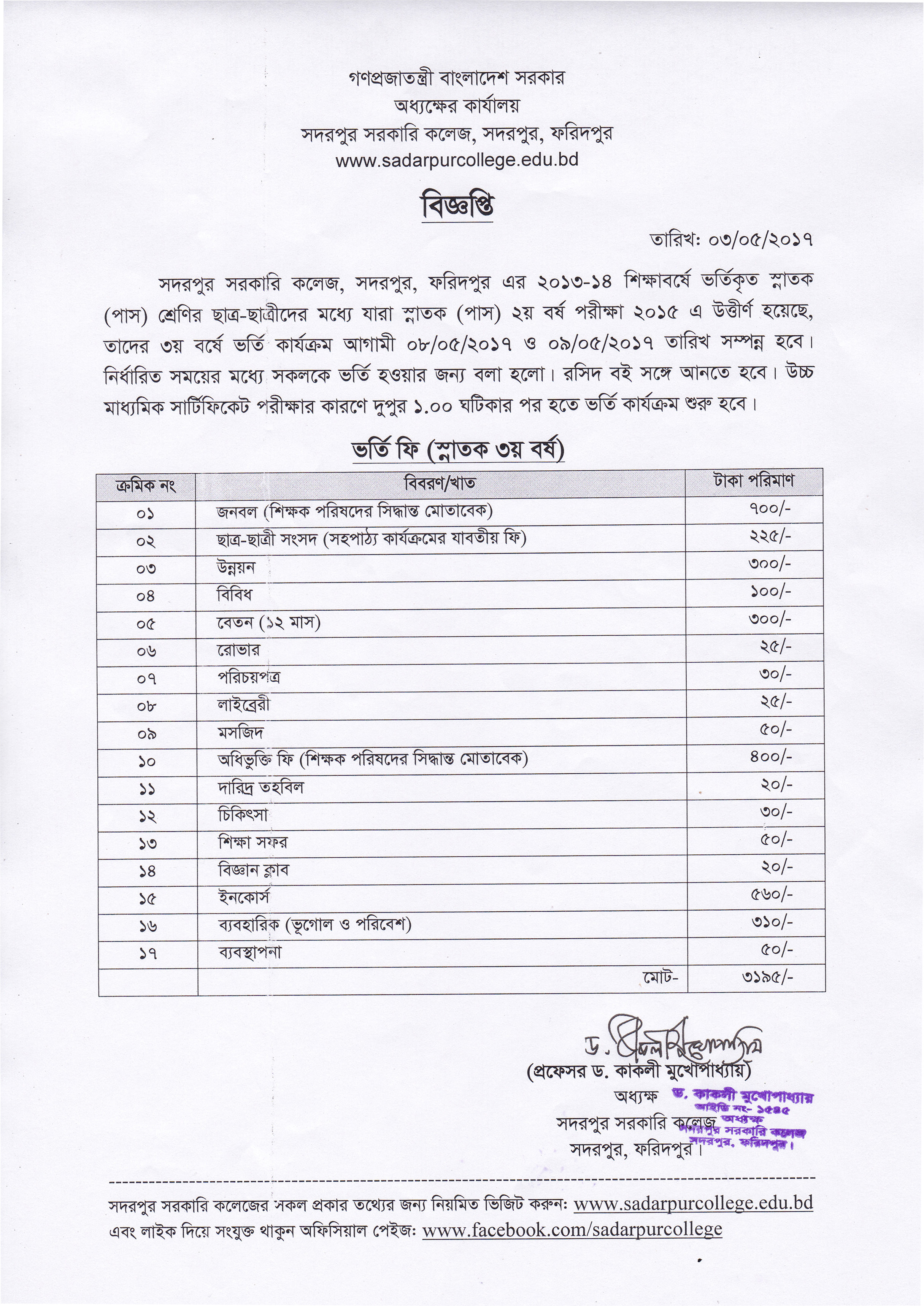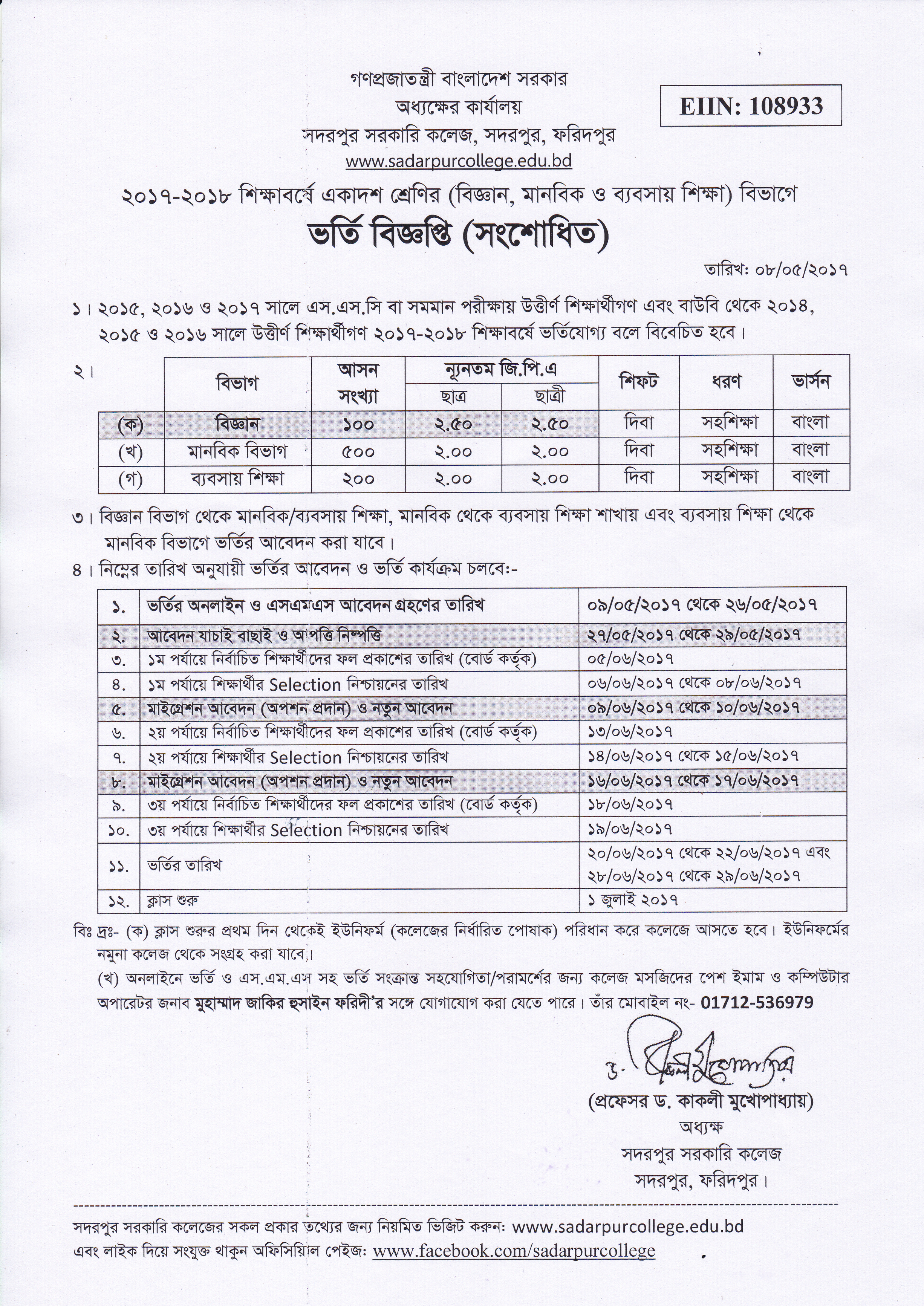0By adminIn Notice Posted May 15, 2017বিজ্ঞপ্তিবিজ্ঞপ্তি সদরপুর সরকারি কলেজের একাদশ শ্রেণির বার্ষিক পরীক্ষা- ২০১৭ এর ইংরেজি পরীক্ষা অনিবার্য কারণবশত ১৬/০৫/২০১৭ এর পরিবর্তে ১৯/০৫/২০১৭ শুক্রবার সকাল নয়টা থেকে অনুষ্ঠিত হবে। অন্যান্য পরীক্ষাসমূহ [...]Read More