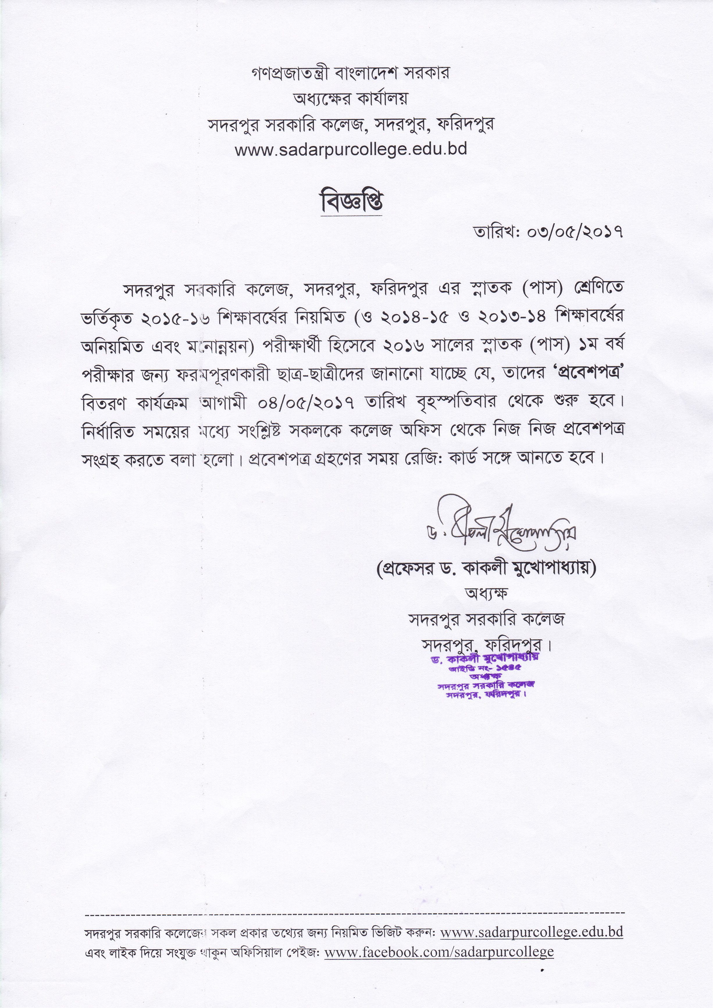 0By adminIn Notice Posted May 4, 2017স্নাতক (পাস) ১ম বর্ষ পরীক্ষা ২০১৬ এর প্রবেশপত্র বিতরণ সংক্রান্ত বিজ্ঞপ্তিRead More