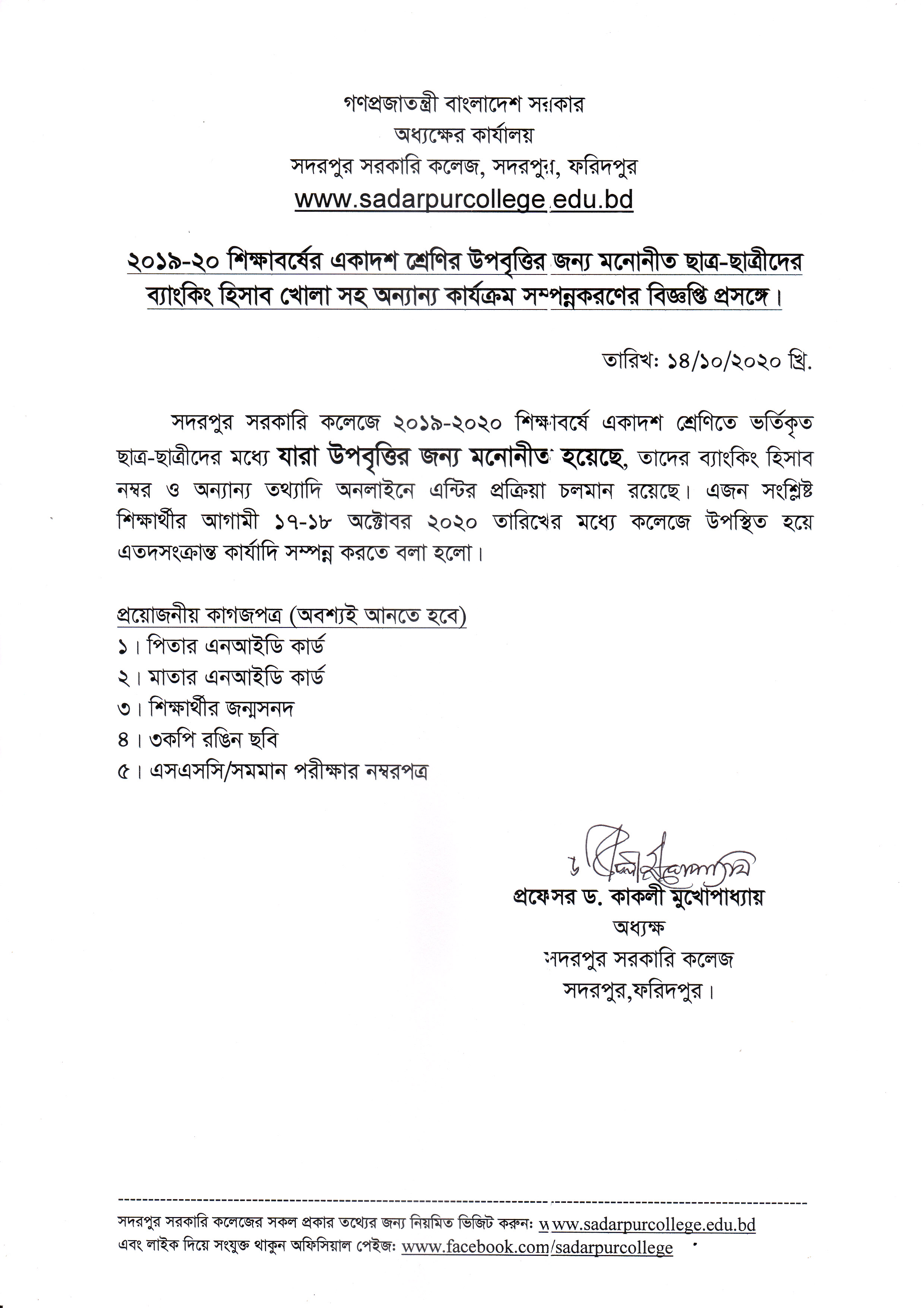 ২০১৯-২০ শিক্ষাবর্ষের একাদশ শ্রেণির উপবৃত্তির জন্য শিক্ষার্থীদের ব্যাংক হিসাব খোলা সংক্রান্ত বিজ্ঞপ্তি