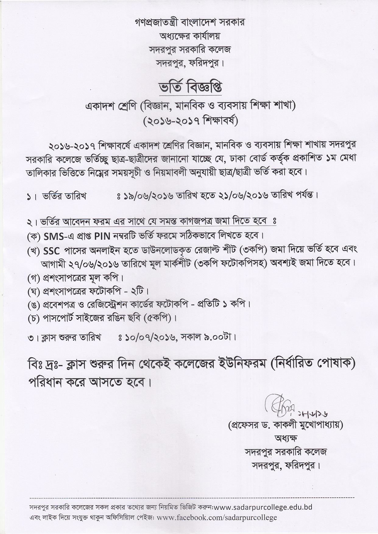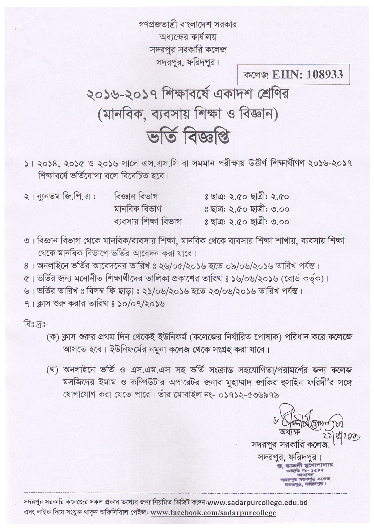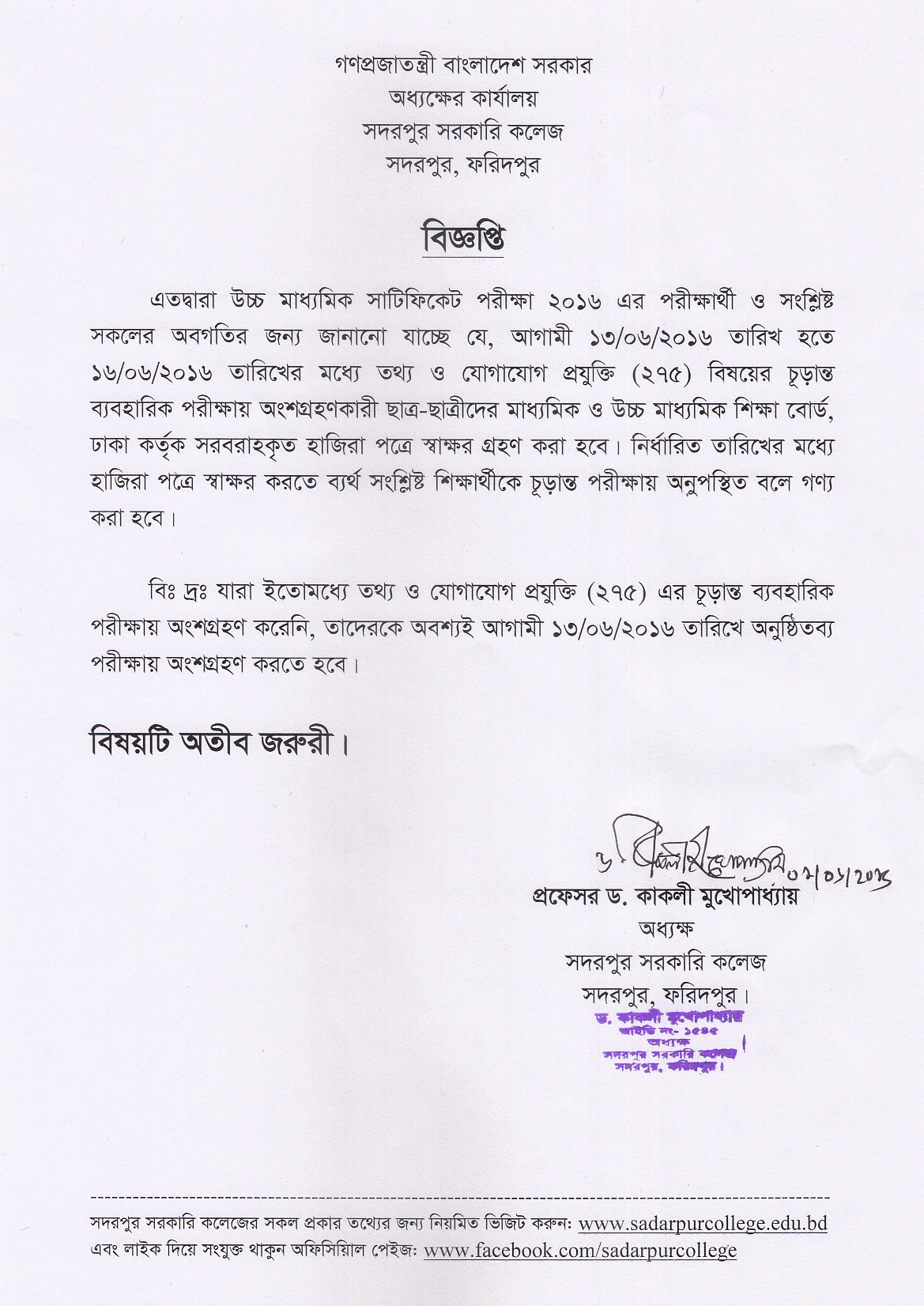 গণপ্রজাতন্ত্রী বাংলাদেশ সরকার অধ্যক্ষের কার্যালয় সদরপুর সরকারি কলেজ সদরপুর, ফরিদপুর বিজ্ঞপ্তি এতদ্বারা উচ্চ মাধ্যমিক সাটিফিকেট পরীক্ষা ২০১৬ এর পরীক্ষার্থী ও সংশ্লিষ্ট সকলের অবগতির জন্য জানানো [...]