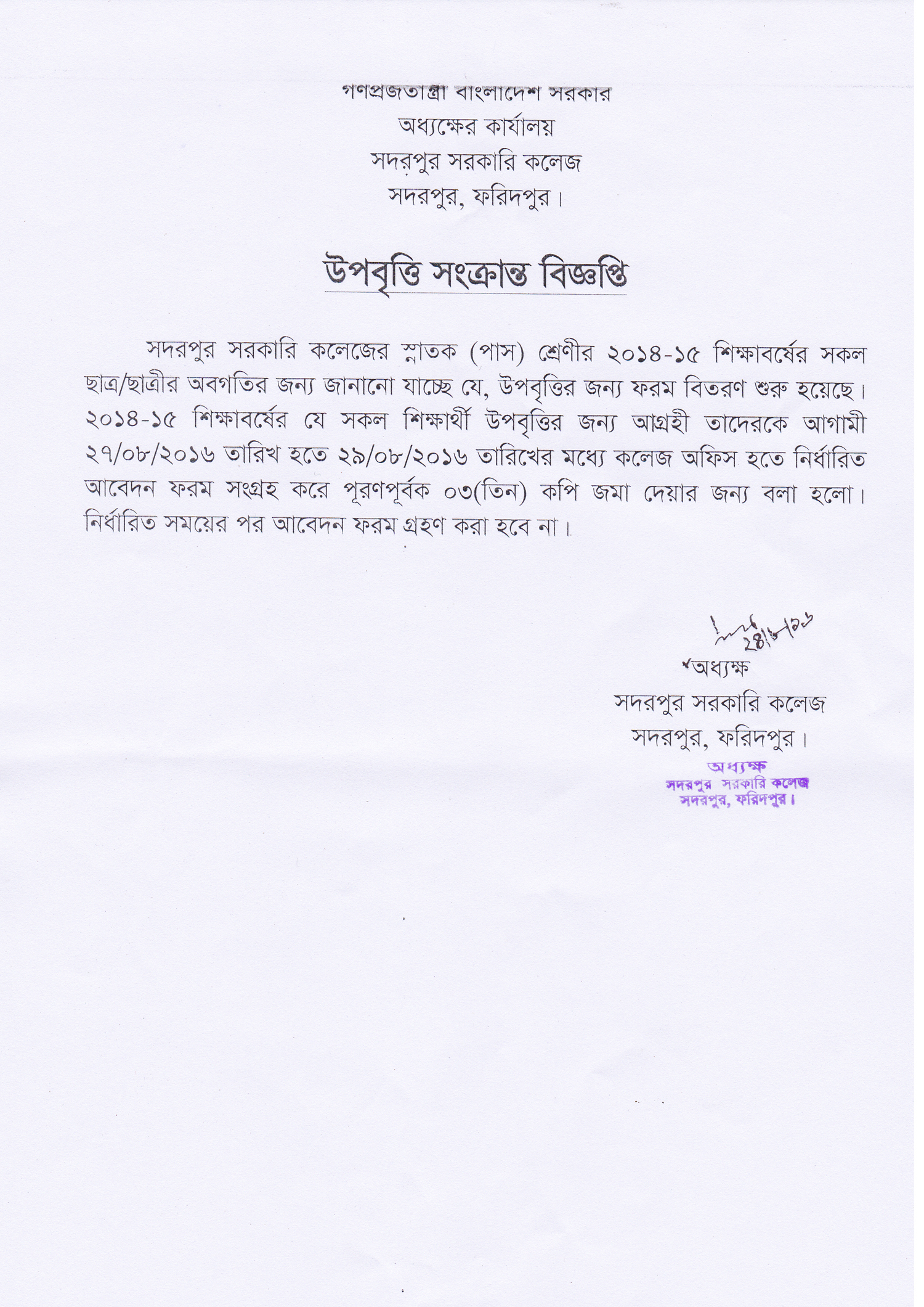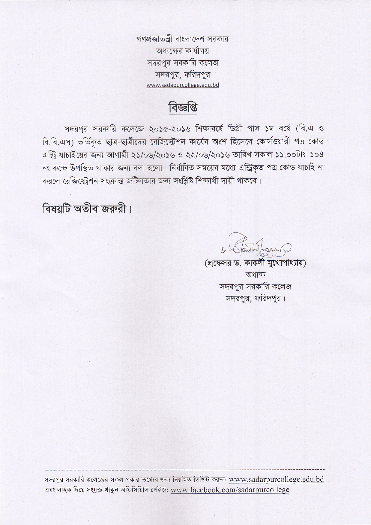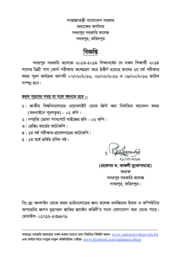 গণপ্রজাতন্ত্রী বাংলাদেশ সরকার অধ্যক্ষের কার্যালয় সদরপুর সরকারি কলেজ সদরপুর, ফরিদপুর বিজ্ঞপ্তি এতদ্বারা উচ্চ মাধ্যমিক সাটিফিকেট পরীক্ষা ২০১৬ এর পরীক্ষার্থী ও সংশ্লিষ্ট সকলের অবগতির জন্য জানানো [...]