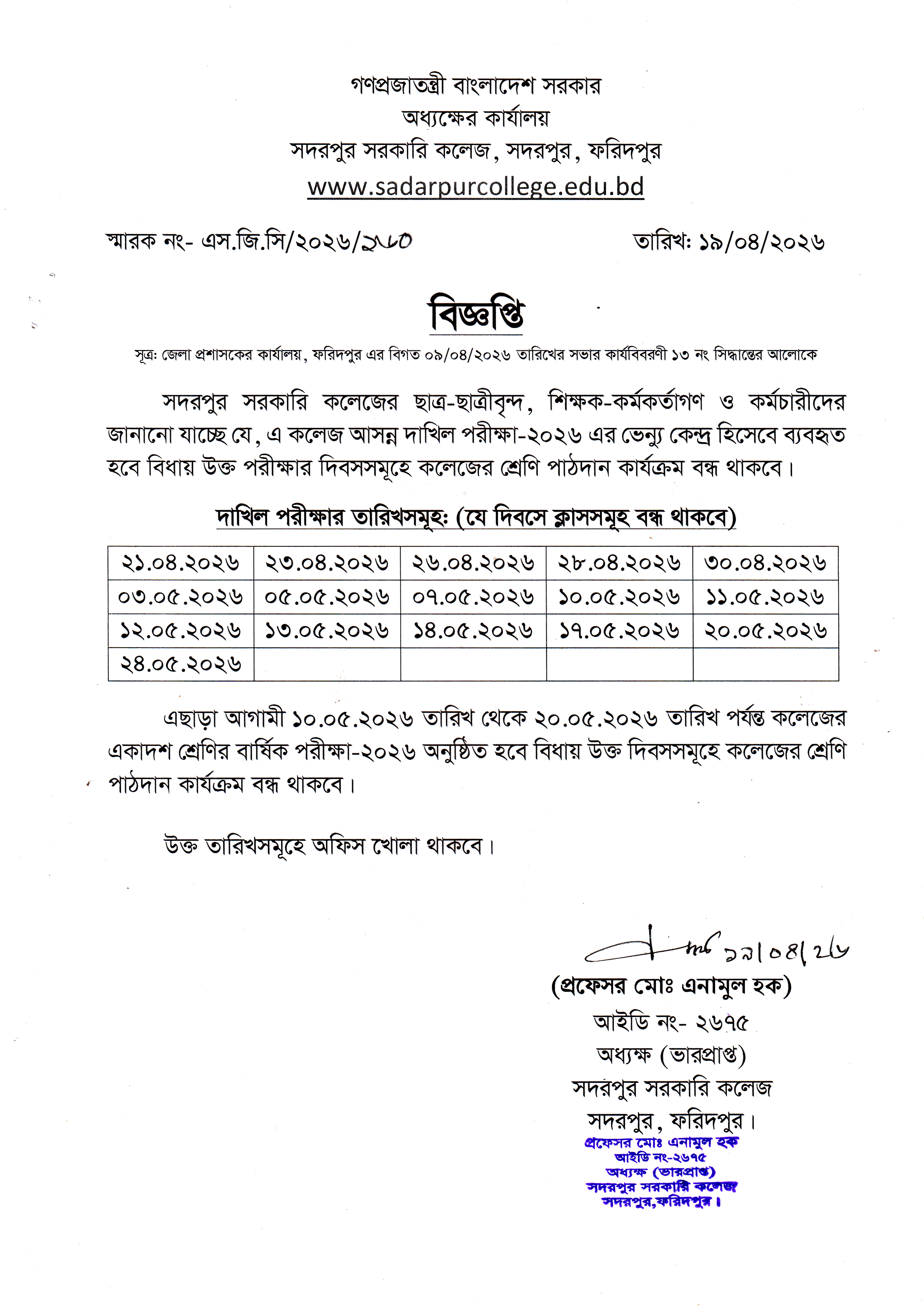 0By Sadarpur CollegeIn Notice Posted April 20, 2026দাখিল পরীক্ষা-২০২৬ চলাকালীন (পরীক্ষাবিহীন দিনগুলোতে) ক্লাস চালু রাখা প্রসঙ্গেRead More