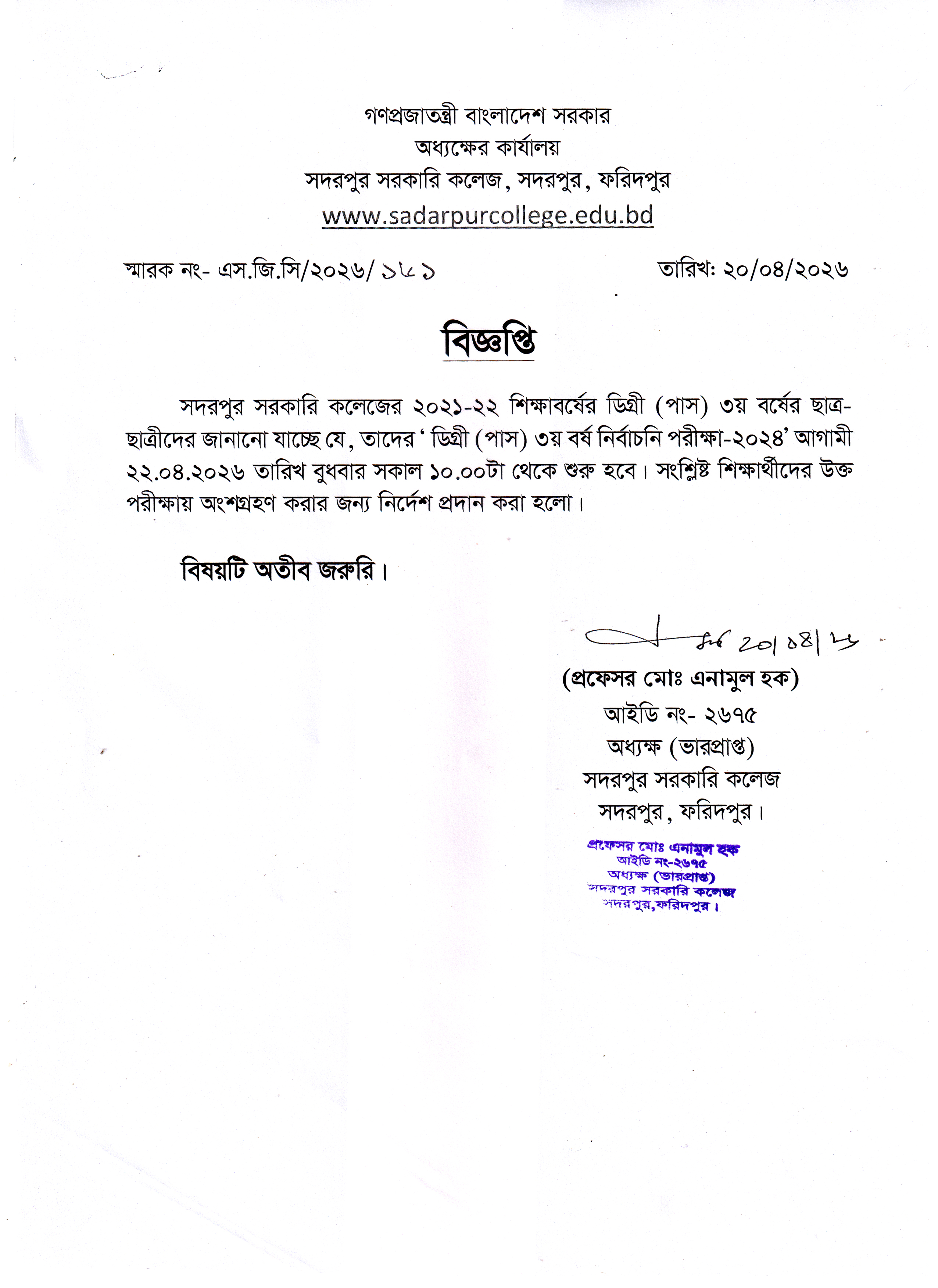 0By Sadarpur CollegeIn Notice Posted April 20, 2026ডিগ্রী (পাস) ৩য় বর্ষ ইনকোর্স পরীক্ষা- ২০২৪ সংক্রান্ত বিজ্ঞপ্তিRead More