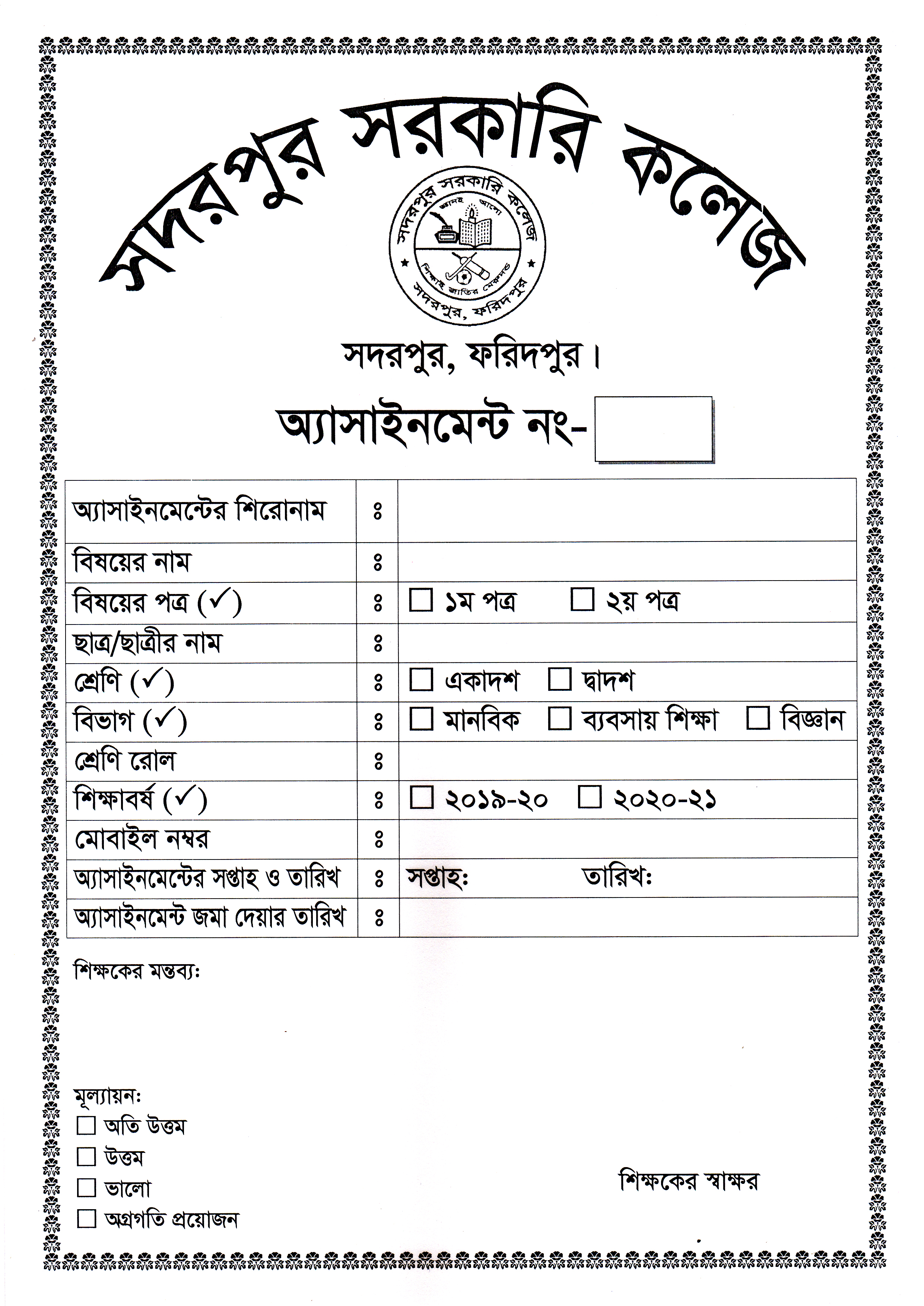 অ্যাসাইনমেন্টের কভার পেইজের নমুনা