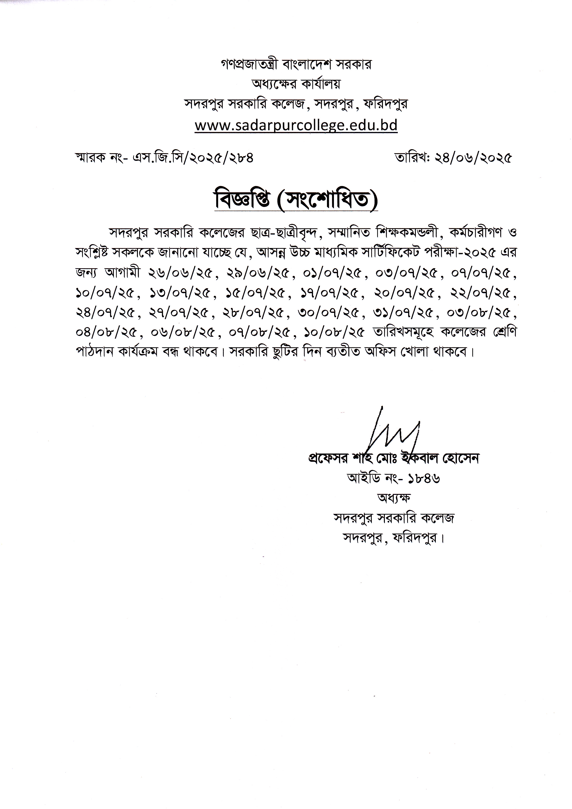 এইচএসসি পরীক্ষা-২০২৫ চলাকালীন পরীক্ষাবিহীন দিনগুলোতে শ্রেণি পাঠদান কার্যক্রম চালু থাকা সংক্রান্ত বিজ্ঞপ্তি